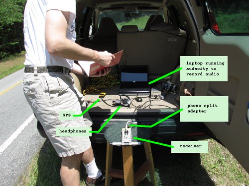 Fig. 3. Recording setup at the back of the car. The audio from the receiver was split so that it could be easily monitored with earphones.
