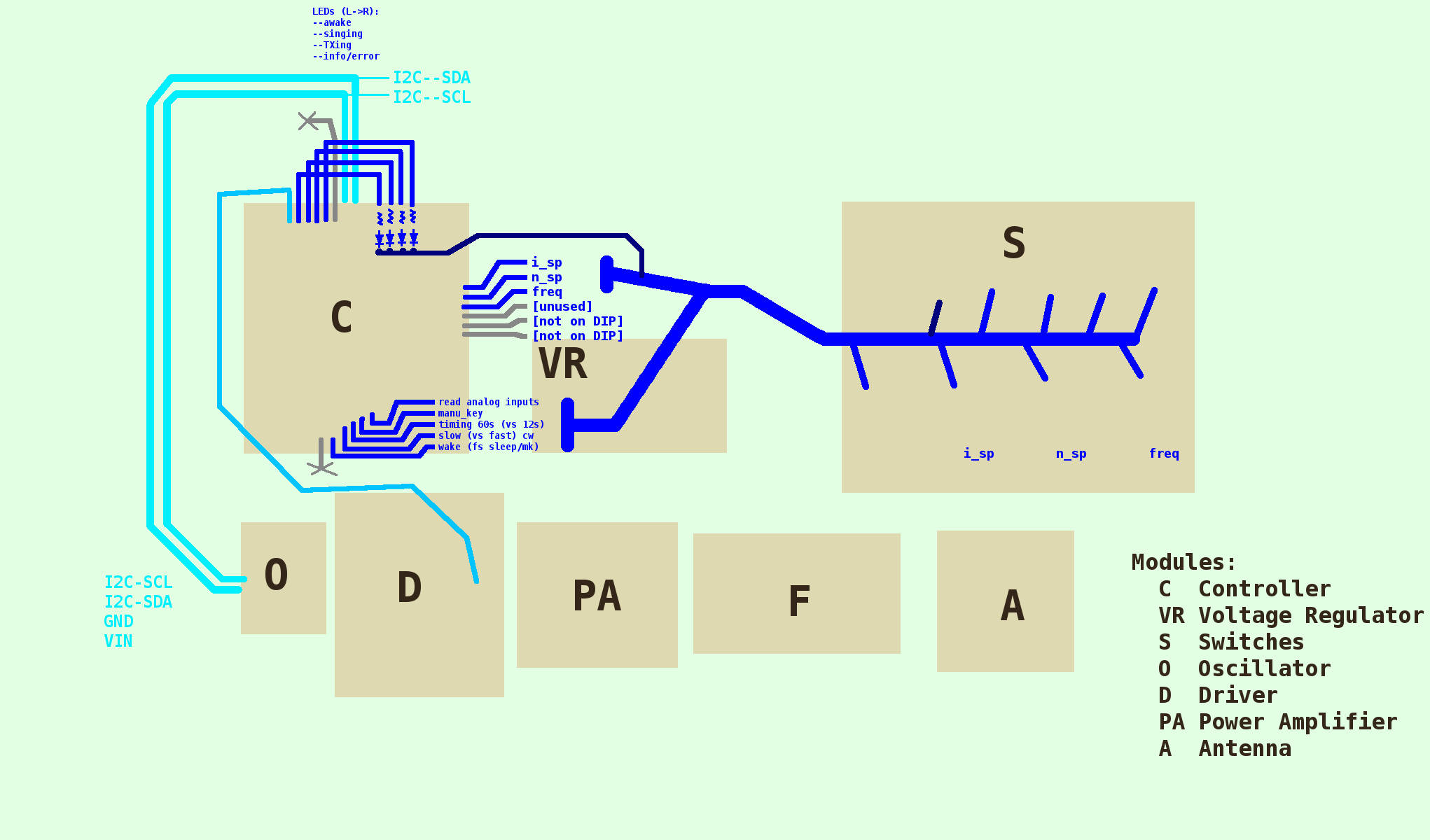 Fig. 2. Block diagram showing the modules, voltage supply lines, and RF lines. The positions of the blocks match those of the modules in the Fig. 1 picture. Modules are as follows: S switches, VR voltage regulator, C controller, O oscillator, D driver, PA power amplifier, F filter, A antenna connector.