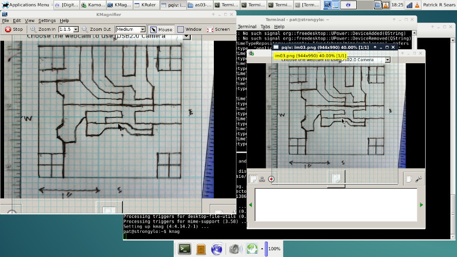 Fig. 2. Diagram under the microscope. I'm imaging it to adjust the scaling and to ensure there is no distortion. When the kamoso image matches the pqiv image, I'll remove the paper and start tracing on the coper with a sharpie.