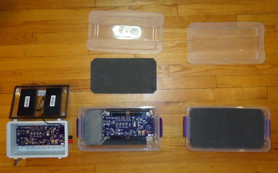 Fig. 4. Transmitters opened up to show the insides. TX #1 at left has a nice enclosure. TX #2 and #3 are placed in shoe-box sized Sterilite boxes with foam padding. TX #2 in the center has the top padding removed and shows PCB.