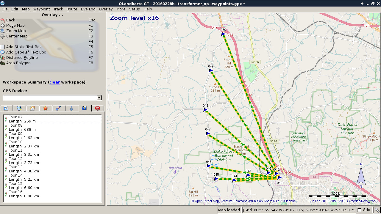 Fig. 1. Using QLandkarteGT to measure distances from the antenna to the listening locations. This is the map used for the second experiment. I used QLandkarte's polyline feature to measure the distances.