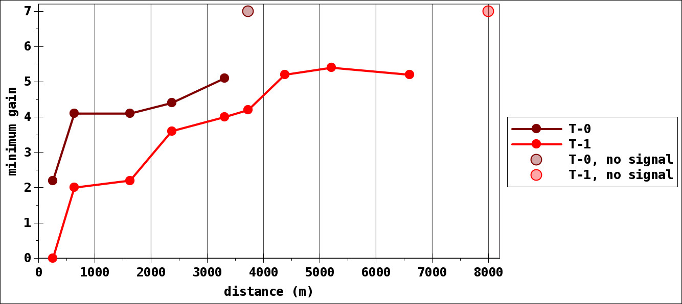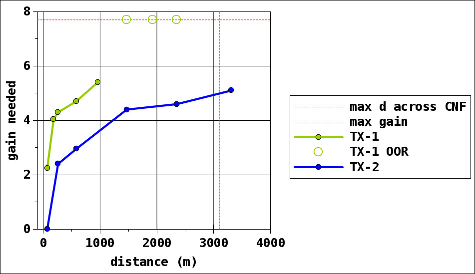 The first experiment (Fig. 6) was the comparison of our old transmitters (TX-1) with our new ones (TX-2). The old ones have a fixed power output of about 30 mW (I need to check this). The new ones have a controllable power output which I had set to about 1 W and which could reach over 5 W. As you can see, I could hear TX-1 out to about 1000 m. That has worked well for around the school or for quick practices. And these transmitters are nice and small. The TX-2 we could still hear beyond 3 km. Seeing this... Well it was Happy Times. We put a lot of work into designing and building these and the power output was more than marginal.