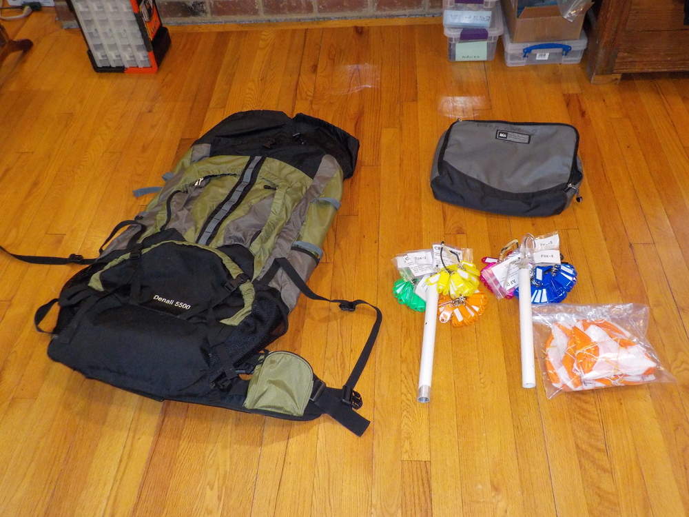Fig. 1. Backpack, finder tags on ground rods, control flags, bag to hold finder tags. At each control, there is a control flag. Below it, there is a ground rod with "finder tags" on it. We don't have a course timing system yet. Instead, when a participant finds a control, they take one of the "finder tags". When they get to the finish, they show us which controls they found by showing us the finder tags they collected. The color of the finder tags is different at each of the conrols. Also, on the ground rods there is a label marking which fox it is and a second label with our contact information. In the picture, the six ground rods are separated into two sets and inserted into white PVC tubes to protect the bag that holds them. The ground rods and the bag of control flags go in the gray bag at top right. And that goes in the large backpack along with the spools and all the antenna hanging stuff (see next picture).