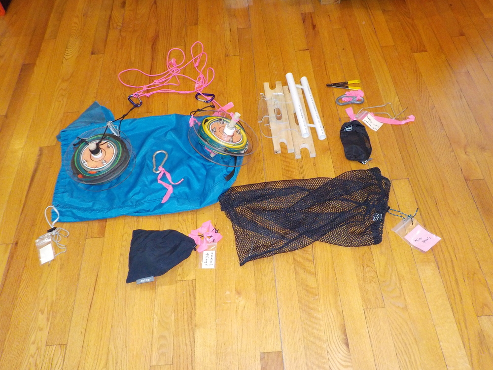 Fig. 2. The spool with verticals and spool with radials are on the blue bag. There are seven sets of verticals and seven sets of radials, one extra of each in case one breaks. The spools can be hung up with the pink string and biners. Between the spools is a heavy carabiner that acts as a weight. Each vertical has a string at the end. We put the weight at the end of the string, put it up over a branch a bit over 6 meters above ground, and let the weight pull the string down and the antenna vertical wire up. To the right are six mini spools to wind up extra string. To the right of that is a small bag which will hold the wire stripers and extra weight just next to it. The stripers are there in case one of the wires breaks close to the banana plug. With stripers, we can expose some wire and connect it to the binding posts on the transmitter. In the foreground to the left, the small black bag holds pink flagging tape to mark the radials. The large black mesh bag to the right will hold the small bags and the mini spools.
