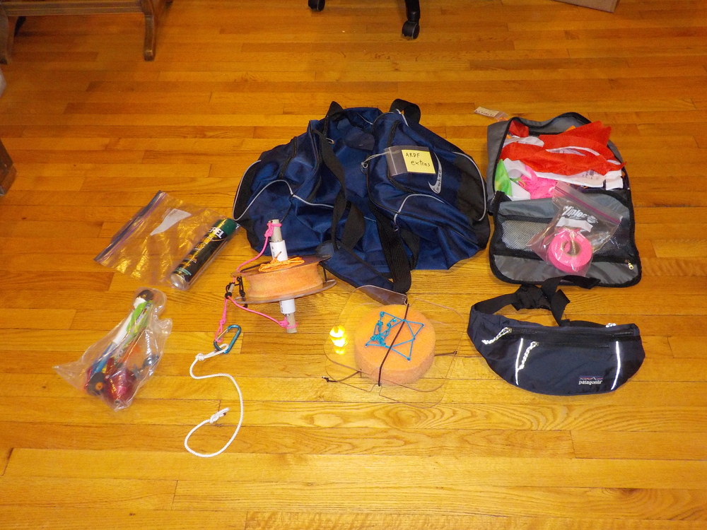 Fig. 10. Extras bag. This one usually stays in the car during the entire event. There are some spare transmitters in case one fails (not in picture). There is some flagging tape and finish shoot flags (bag at top right). Some extra spools in case we need them during pick-up. A tool kit. Mosquito repellent. Some sling shot rockets to put up verticals in case there is a problem with the poles.